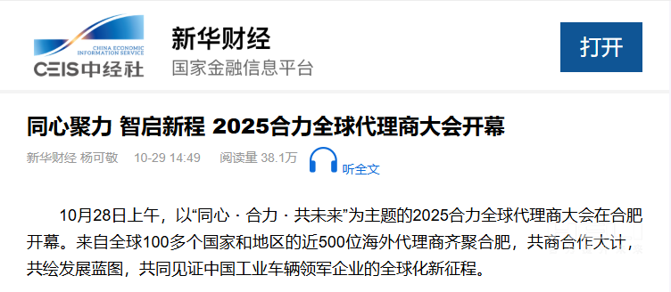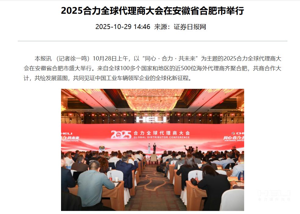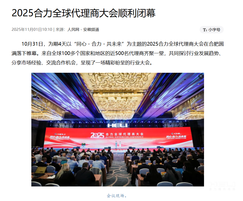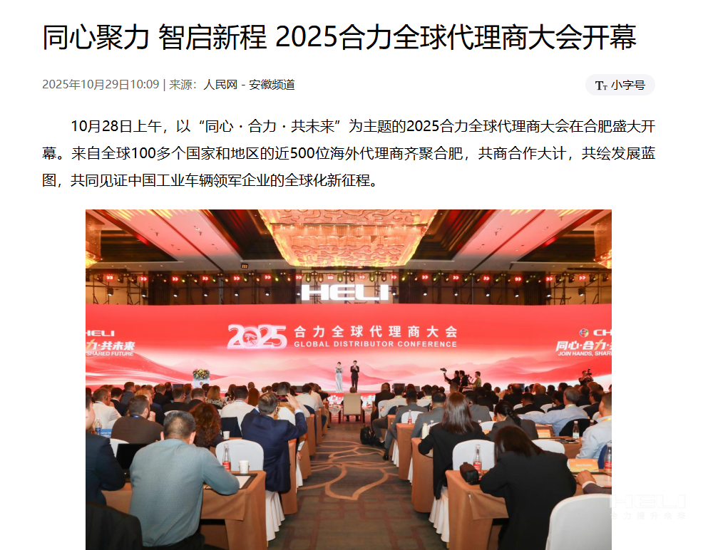 10月28日至31日,“同心?合力?共未來”2025合力全球代理商大會在合肥召開,引發媒體廣泛關注,新華社安徽分社、中央廣播電視臺安徽總站、經濟日報、證券日報、央廣網、中國工業報、人民網安徽頻道、新華網安徽頻道、安徽日報、安徽新聞聯播等28家媒體、46名記者蒞臨現場。中央、省內外及香港、行業媒體競相報道或轉載報道,內容涵蓋戰略發布、智能成果及全球化布局,形式多元、視角鮮活,立體展現合力“智能+綠色”發展新動能,奏響高質量發展強音。
